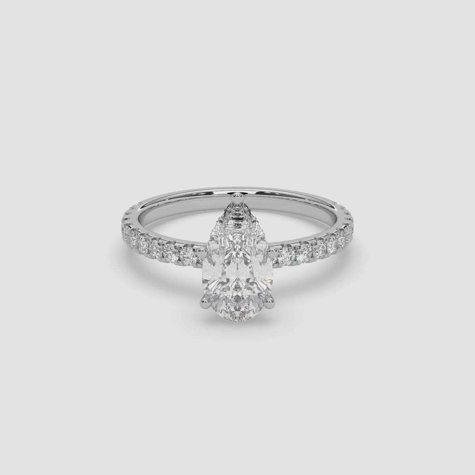 Solid Gold Pear Cut Diamond Engagement Ring with Pave Band & Hidden Halo