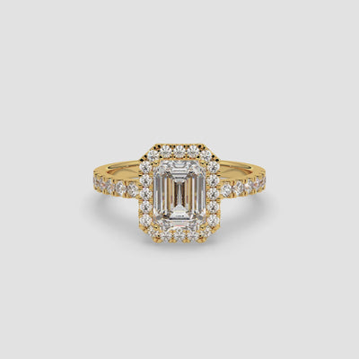 Capture a moment that lasts forever with this exquisite Emerald Cut Halo Engagement Ring. Expertly crafted in radiant 18k gold, this piece combines vintage-inspired sophistication with contemporary craftsmanship. The clean, stepped facets of the central emerald-cut stone create a "hall of mirrors" effect, beautifully contrasted by a shimmering border of round brilliant-cut accent stones.