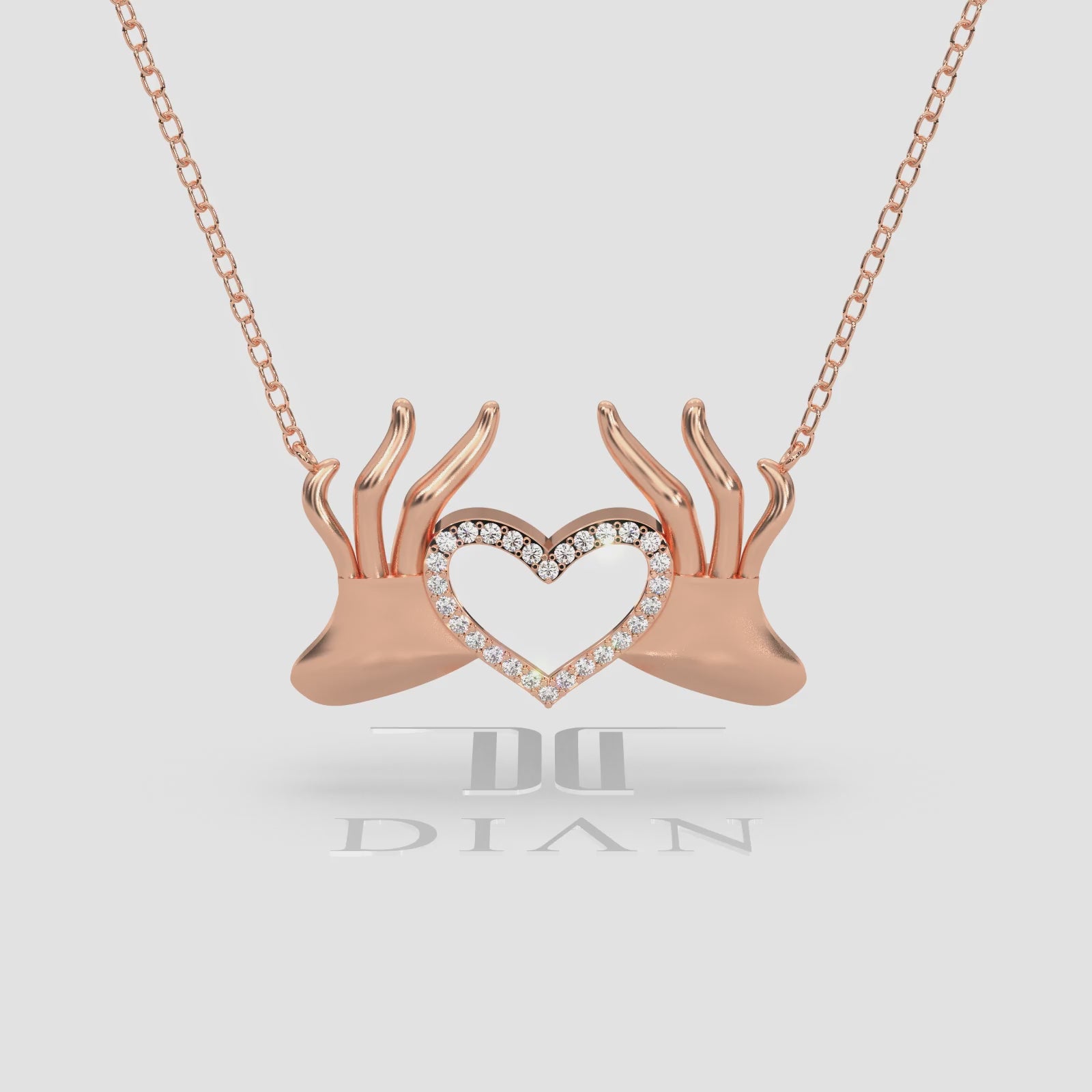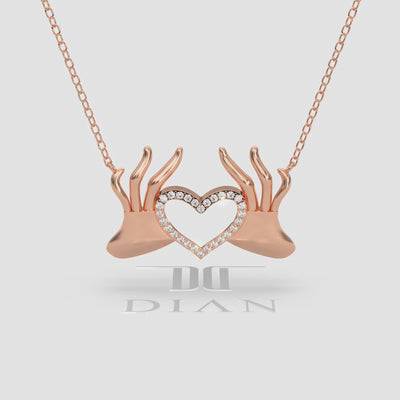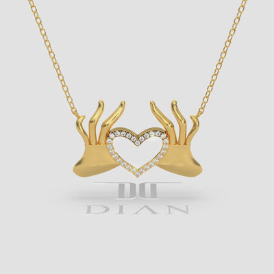 Express your love with our exquisite 18K Gold Hand Heart Necklace. This stunning pendant features two beautifully sculpted hands forming a heart, adorned with sparkling diamond pave accents. A perfect symbol of affection and connection, crafted in luxurious 18K gold, ideal for a meaningful gift or a cherished addition to your fine jewelry collection.