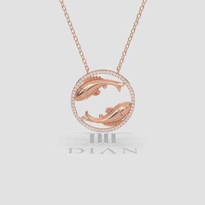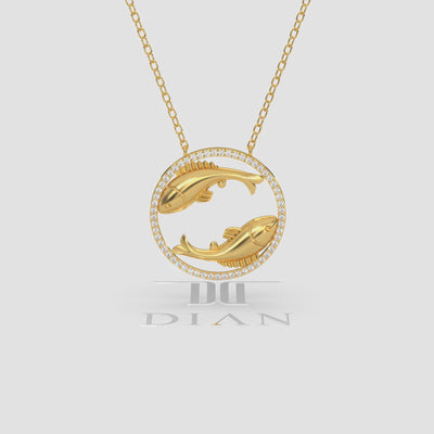 Celebrate your astrological sign with this exquisite 18K yellow gold Pisces zodiac pendant. Featuring two beautifully crafted fish encircled by sparkling diamonds, this elegant necklace symbolizes intuition, empathy, and creativity. A perfect gift for yourself or a loved one.